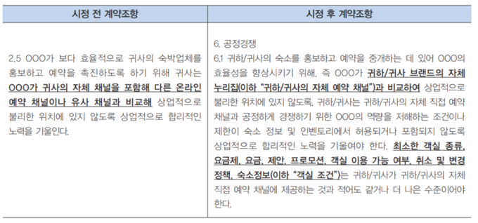 공정거래위원회는 위와 같이 관련 실태 및 해외 규제 사례를 조사하면서, 2019년 12월 경 서울·제주도에 소재한 호텔 16개 업체를 현장방문해, 이들과 거래하는 모든 OTA 사업자의 계약서를 점검했다. 그 결과 상당 수의 대형 OTA 사업자들의 계약서에 넓은 범위의 MFN 조항이 포함돼 있는 것을 확인했다. 해당 사업자들은 조사 과정에서 스스로 MFN 조항을 삭제하거나, 넓은 범위의 MFN 조항을 좁은 범위의 MFN 조항으로 수정했다. 공정거래위원회가 제시한 예시는 다음과 같다.